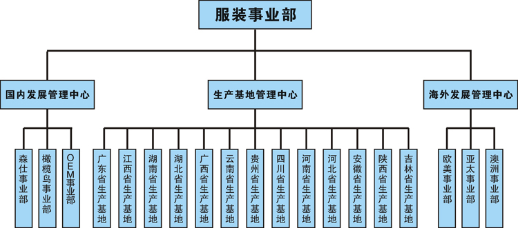 集团实行董事会领导的总裁负责制。下设国际贸易事业部、投资事业部和服装事业部。
